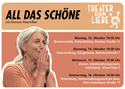 Die Aktionswoche der seelischen Gesundheit 2025 steht unter dem Motto „Lass Zuversicht wachsen – Psychisch stark in die Zukunft” und findet vom 10. bis 20. Oktober deutschlandweit statt. Im Landkreis Rotenburg veranstaltet das Bündnis gegen Depression im Landkreis Rotenburg e.V. in Kooperation mit der GESO gGmbH und TANDEM e.V. vier Theateraufführungen. Anja Kleinhans spielt eine Tochter, die ihre Mutter mit 1000 guten Gründen davon abhalten will, Suizid zu begehen. Das Stück beleuchtet humorvoll und eindringlich, wie schwierig und zerbrechlich die Balance zwischen Verzweiflung und Lebensmut ist. Tickets für 15,00 Euro können per Mail vorbestellt werden. Eine Abendkasse steht ebenfalls zur Verfügung.